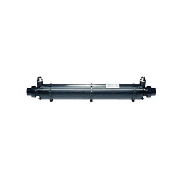 Water/water heat exchanger with corrugated coiled tubing in cross flow, stainless steel or titaniumcorrugated coiled tubing, offers high energy efficiency. The plastic shell can endure high pressure and is corrosion resistant. The individual components are sealed with silicon gaskets and ensure longevity of the whole heat exchanger. Like all coiled tubing heat Exchanger, they must be integrated in the bathing water circuit either directly or through the bypass-system. Material shell is made of PA66/PP-30% FG.