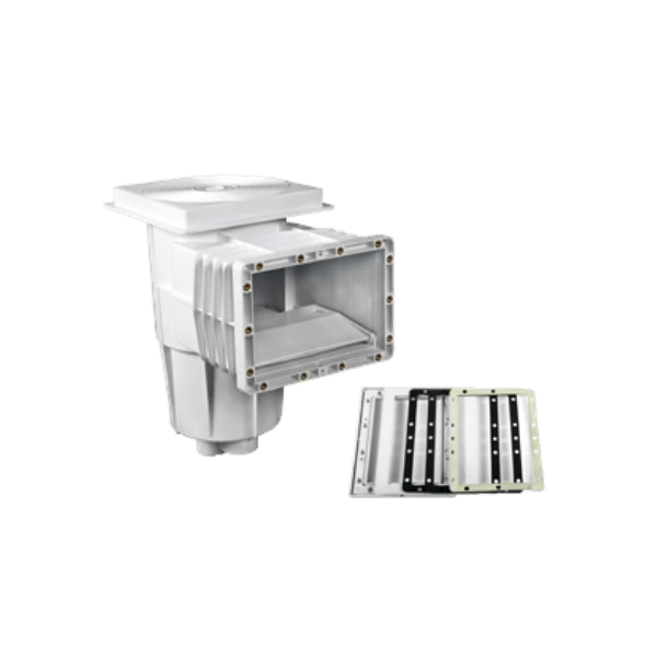 Manufactured in UV treated white ABS with top square lid and frame. With flap and flow regulation plug. Supplied with extra strong plastic basket with handle. Skimmer has an option of 3 connection sizes: 1½” internal threaded, 2” threaded and 50mm diameter for gluing. Overflow connection of 40mm diameter. Max. Recommended flow is 5m3/h. For optimum results it is recommended to use 1 skimmer per 25m2 of pool surface area. The skimmer suction can also be used for vacuum cleaning the pool floor.