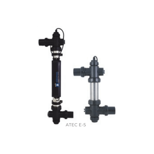 Atec E-Series UV System disinfection in a very compact design, with easily replaceable lamps that are with single base. Suitable for residential pools, fish ponds, residential drinking water treatment. The UV lamp provides a UV dose of 30 mj/cm², which is sufficient disinfection and protection against 99.9% chlorine resistant micro-organisms.