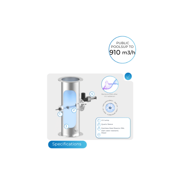 Permanent disinfection and destruction of unhealthy trichloramine in one compact system with unique LifeAGE® technology. The unique LifeAGE® technology will reduce operating costs by up to 50% compared to standard UVM systems, extend the lifetime of UVM lamps by up to 100%, ensure automatic regulation of the UVM lamp radiation performance according to the current pool water pollution. Reduction of chlorine dosage by up to 50%.